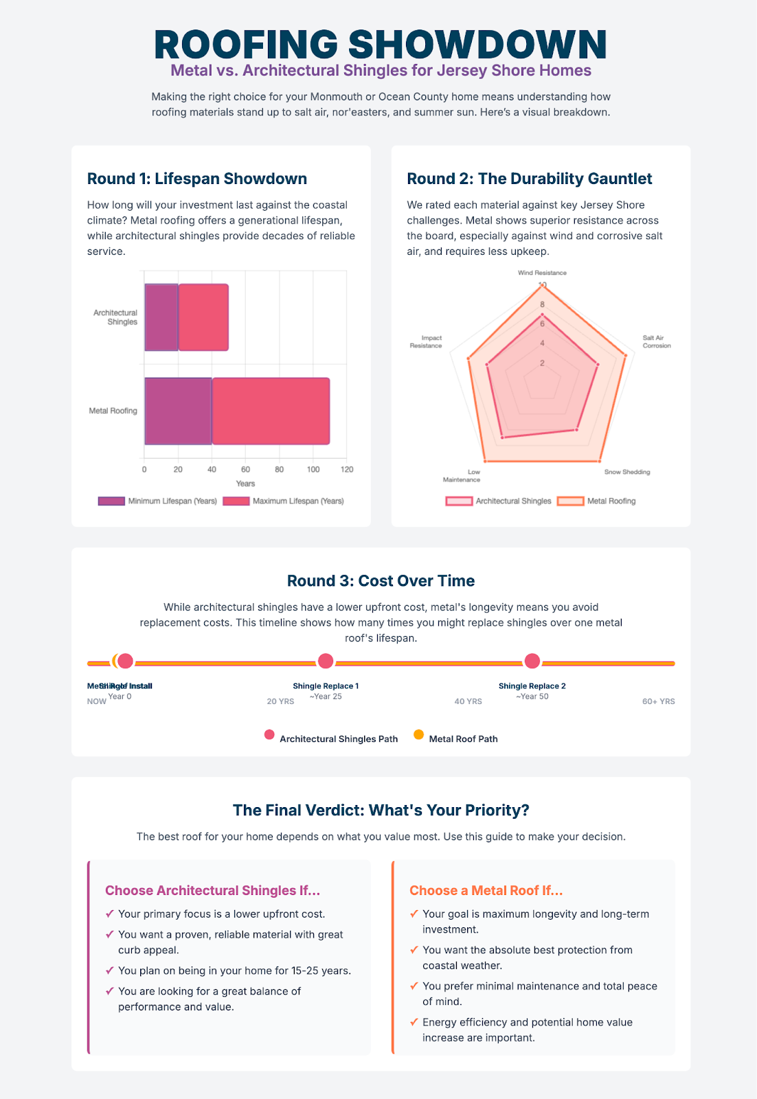 When it comes to protecting your home in Monmouth or Ocean County, your roof is your first and most important line of defense. The decision to replace it is one of the most significant investments you’ll make as a homeowner, and it’s a decision that goes far beyond simple aesthetics. For New Jersey residents, especially those near the coast, the choice often comes down to two leading contenders: the classic architectural asphalt shingle and the increasingly popular metal roof.